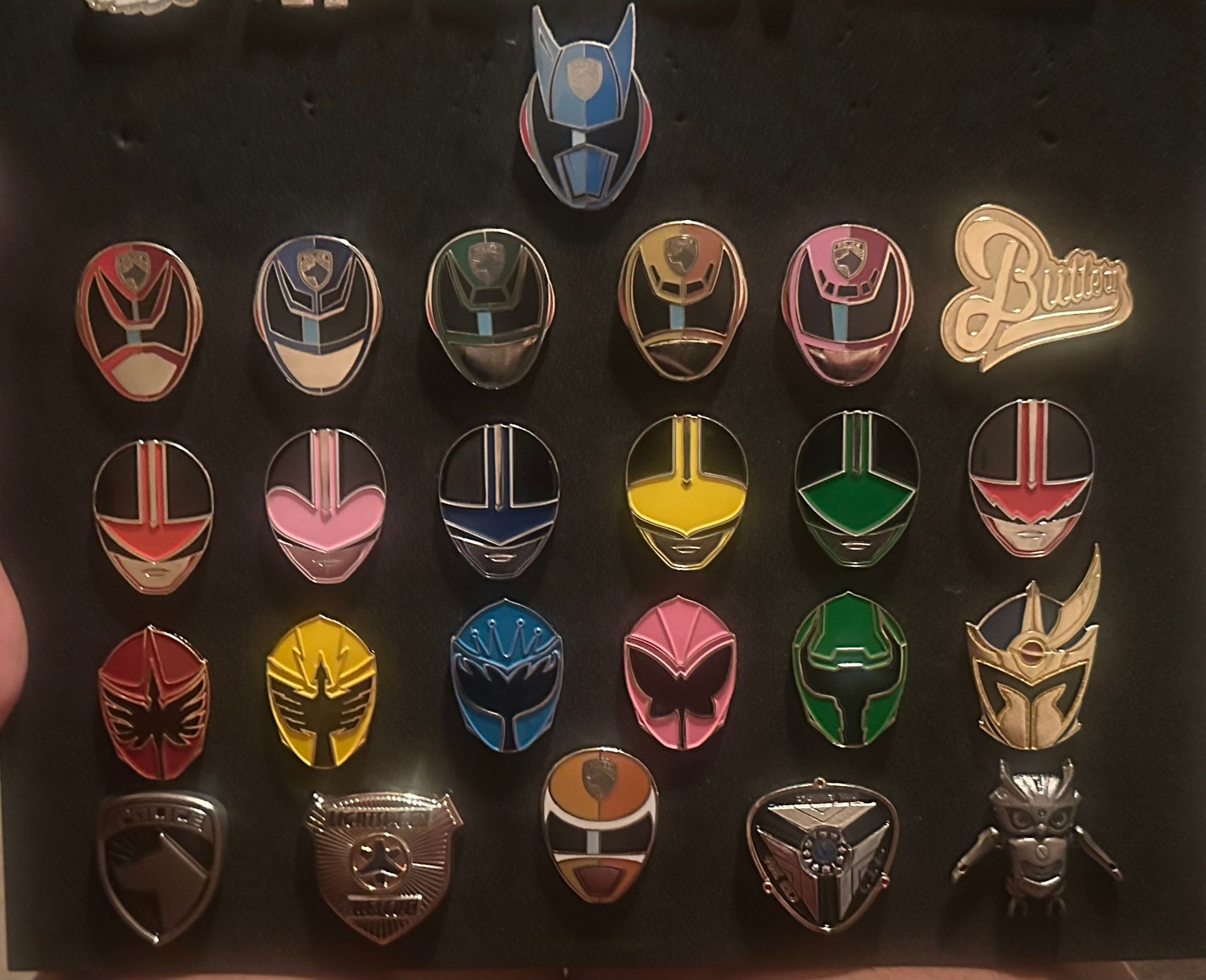 Power Rangers pins by a variety of sellers. S.P.D. Pins by S.P.D. Executive Producer Greg Aronowitz (@gregaronowitz on Instagram), Time Force and Mystic Force pins by CeeVeeIllustrations (@ceevee.co on Instagram), and Power Rangers Badge/Circuit pins by HenshinVault (@HenshinVault on Instagram).